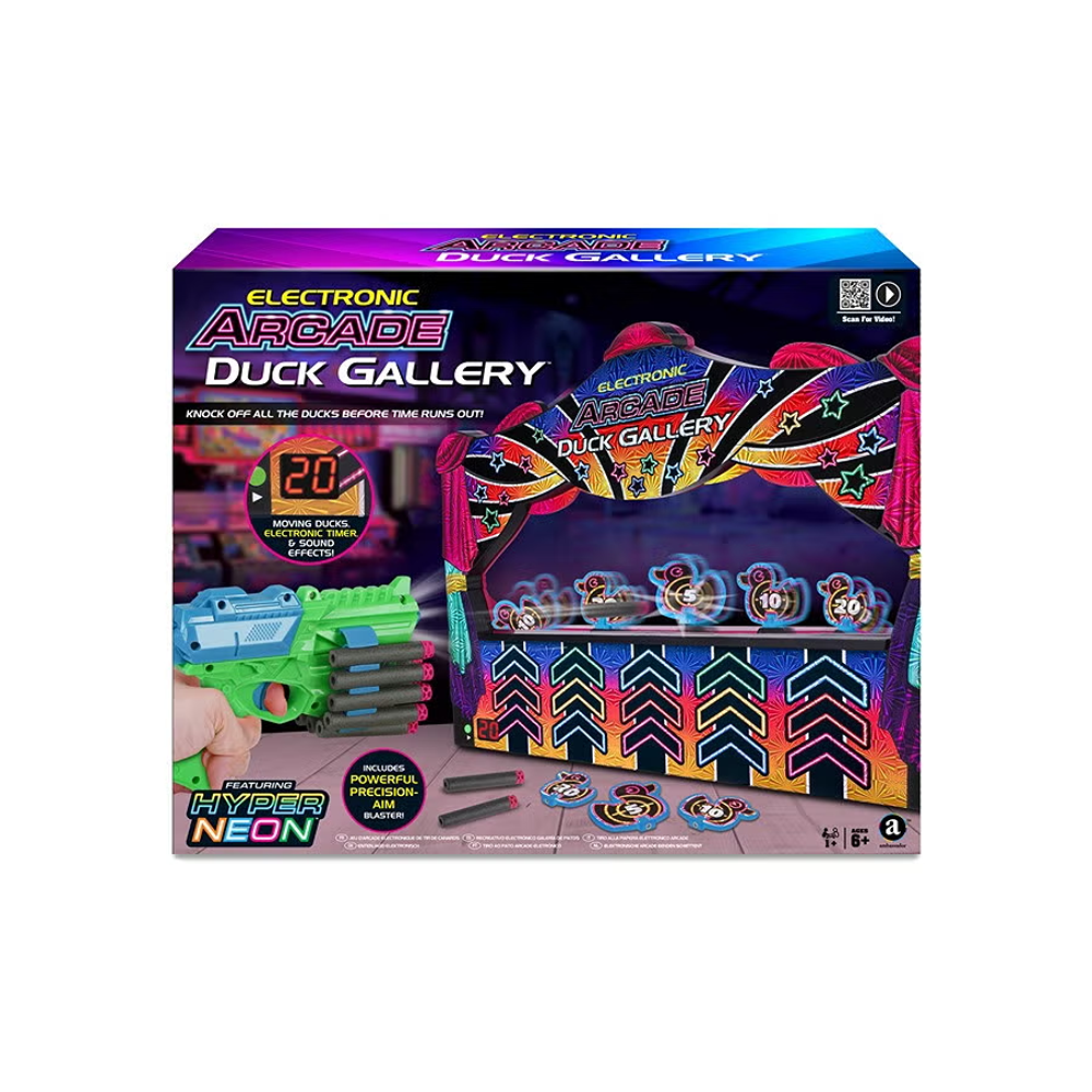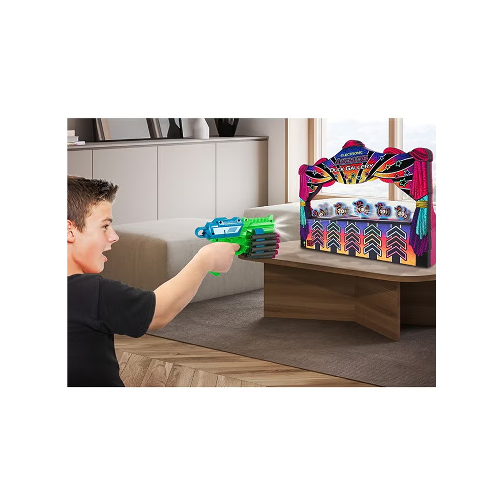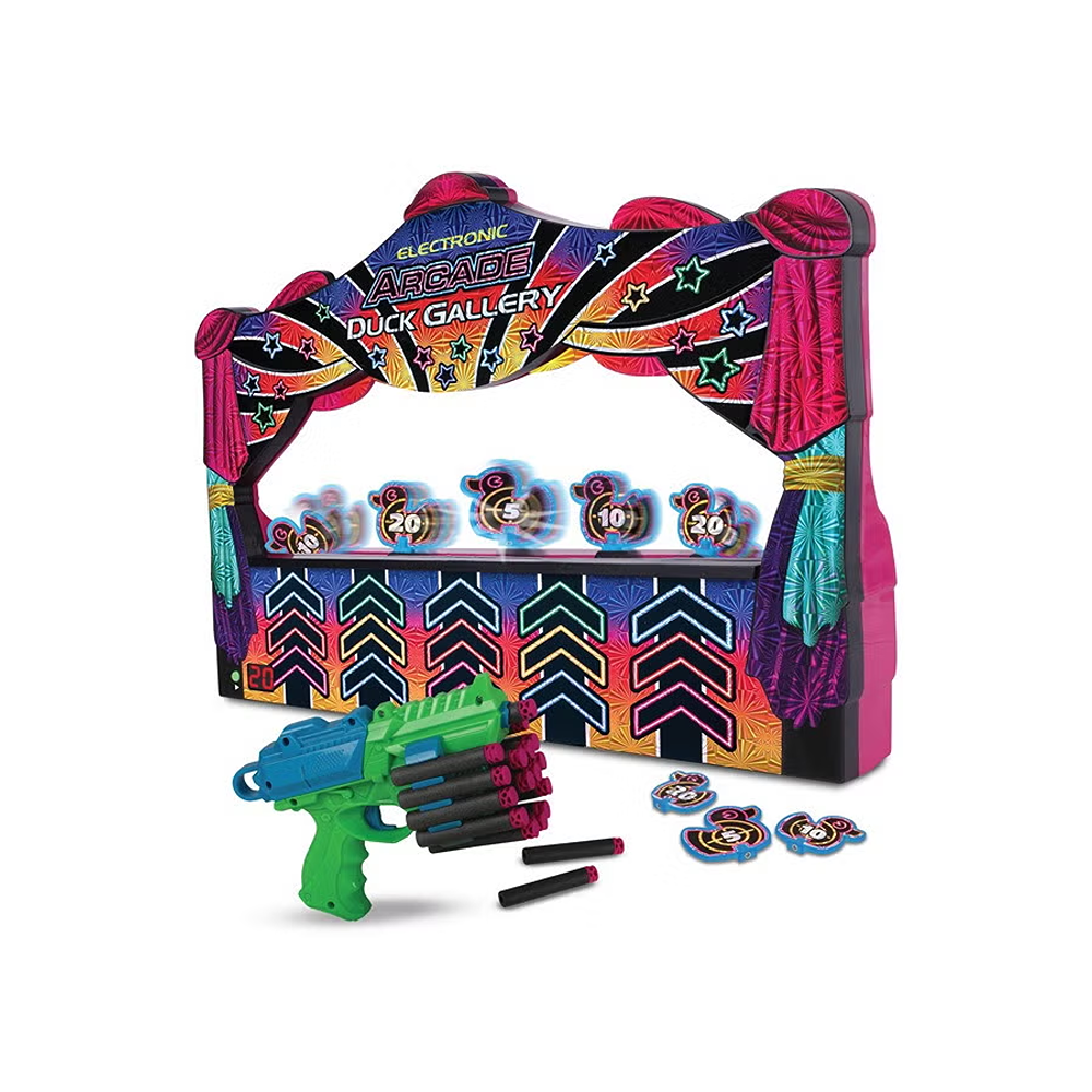 Step right up, step right up! Everyone’s a winner in this fun and exciting version of the classic duck gallery shooting game! Just like the carnival & arcade versions, the objective is to knock over as many ducks as you can in 60 seconds. Each duck rotates around the stage along the moving conveyor belt, increasing the challenge. The ducks also come in 3 sizes, each with a different point value, so take careful aim at the smallest ones to increase your score! Carnival music and duck quacking sounds add to the atmosphere, while the bright LED timer lets you know how much time is remaining. Once you’re done, collect the ducks and tally up your score. Replace the ducks on the belt and you’re ready to play again – everyone can take turns trying to set a new record! Comes ready to play with a blaster & darts