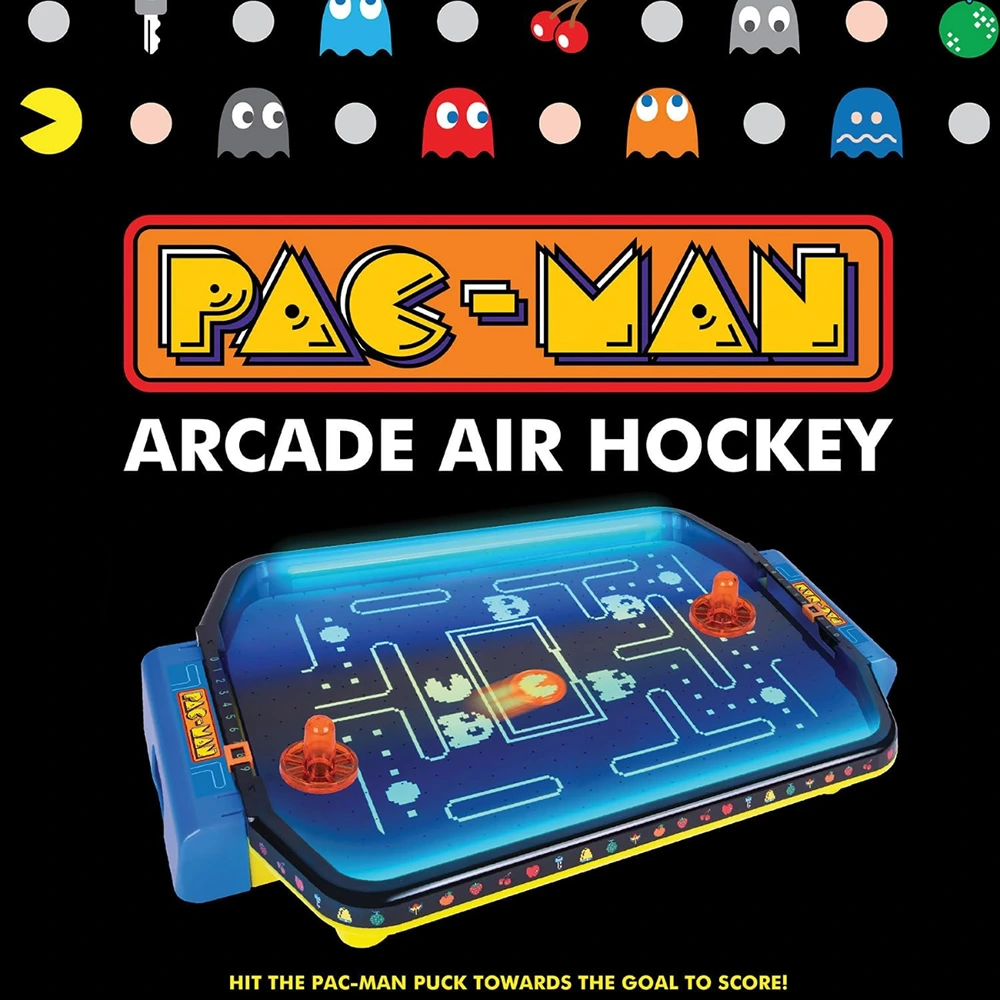 Bring the thrills and excitement of the arcade at home with the Electronic Pac-Man Arcade Air Hockey! For years, air hockey has captivated arcade visitors of all ages as the puck glides and rebounds over the table surface at incredible speeds. This set offers all the fun in a compact set. Just like the arcade version, you need to knock the puck into your opponent’s goals. Turn the machine on to start the airflow, and see the puck start to magically hover around the playing surface. Challenge a friend and start your game. Shoot directly at the goal or bounce it off one of the walls to confuse your opponent and increase your odds of scoring. Includes neon lighting along the walls of the table for a true arcade experience.