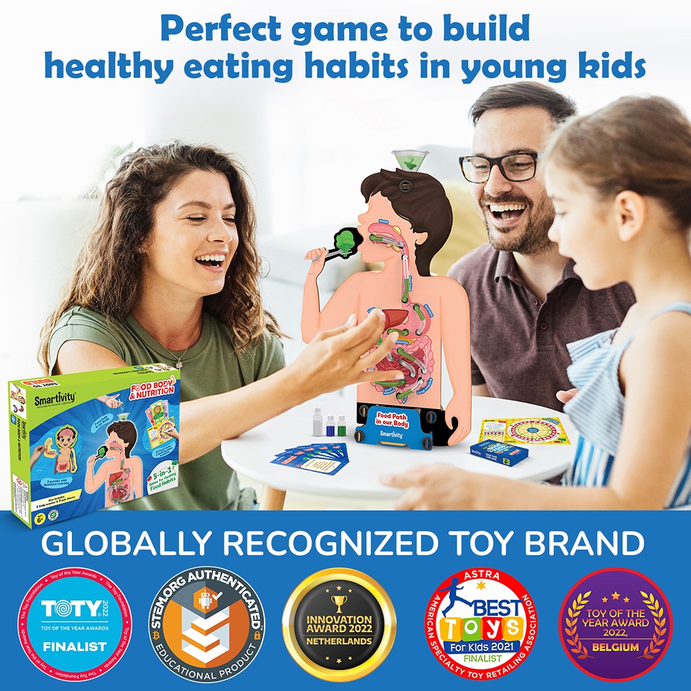 Introducing the ultimate solution to the epic battle of making your munchkin embrace the world of healthy eating! Behold the Smartivity Food Body & Nutrition—a 5-in-1 STEAM wonder that turns learning about food into a playtime bonanza! Picture this: Your little explorer gets to assemble a mind-blowing 3D model of the human body while diving headfirst into 5 interactive games that make gobbling up knowledge as exciting as a plate of delicious food! Ever wondered how food takes the route through the food path? Curious about the calories party happening in your belly? This quirky STEAM game spills the beans on all things nutrition, food groups, and the path that food takes.