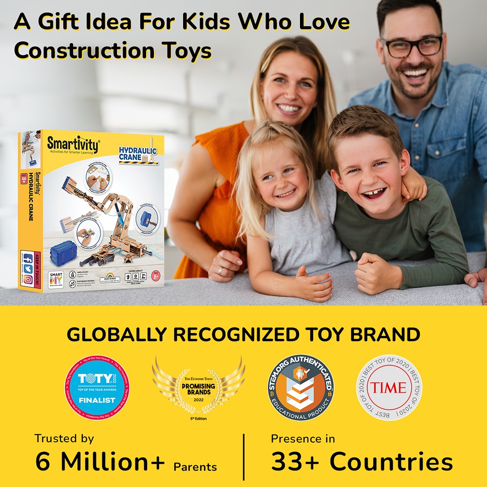 Help your children understand the basics of hydraulic mechanisms with this amazing STEM Learning DIY Educational project kit! Hydraulic Machines use the power of water pressure to carry out specified tasks. From cranes to braking mechanisms, hydraulic power finds widespread use in daily life. Another of cool, innovative Smartivity STEM Learning Educational D.I.Y. Toy Kits, the Smartivity Pump It Move It Hydraulic Crane introduces children to the fundamentals of hydraulic machines in the most playful and engagement filled manner. The kit contains all the elements essential to build a fully-functional hydraulic crane, richly-illustrated and easy-to-understand step-by-step Instruction booklet and tools to embellish the project once built. Once assembled, children can use their Hydraulic Cranes to life objects and move them around. The project assembly provides at least an hour-long engagement and the game-play ensures that children proudly continue to play with the project even after.